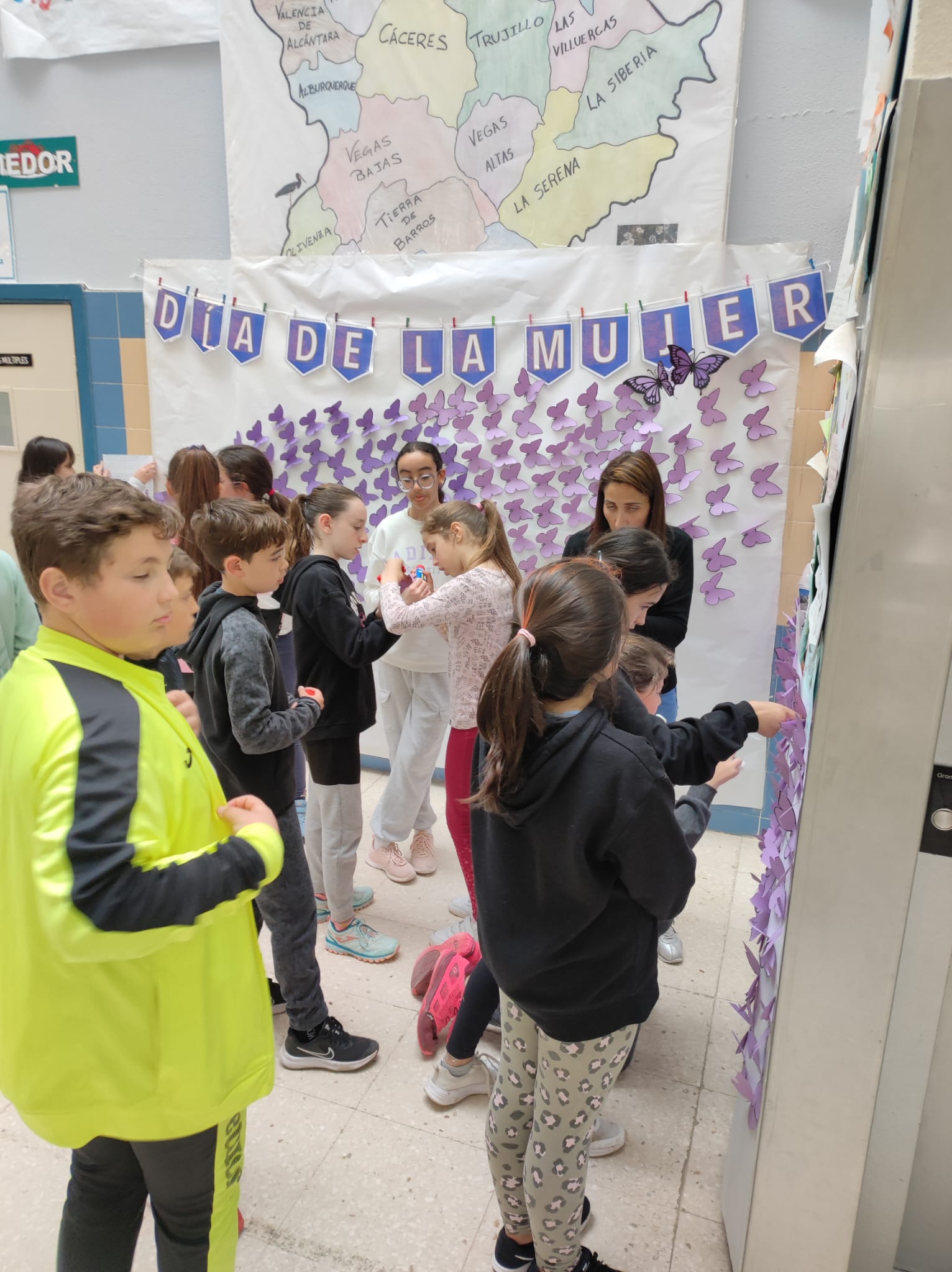 Hoy hemos celebrado en el colegio EL DÍA DE LA MUJER, para ello, hemos trabajado en las diferentes clases contenidos de lo significativo de este día, y como algo juntos, hemos querido hacer un mural que está en la entrada del colegio donde con mariposas y fotos de mujeres importantes para nosotros hemos querido dejar reflejado la importancia que tiene la mujer en nuestra sociedad y que desde la escuela tenemos que trabajar la igualdad entre personas.